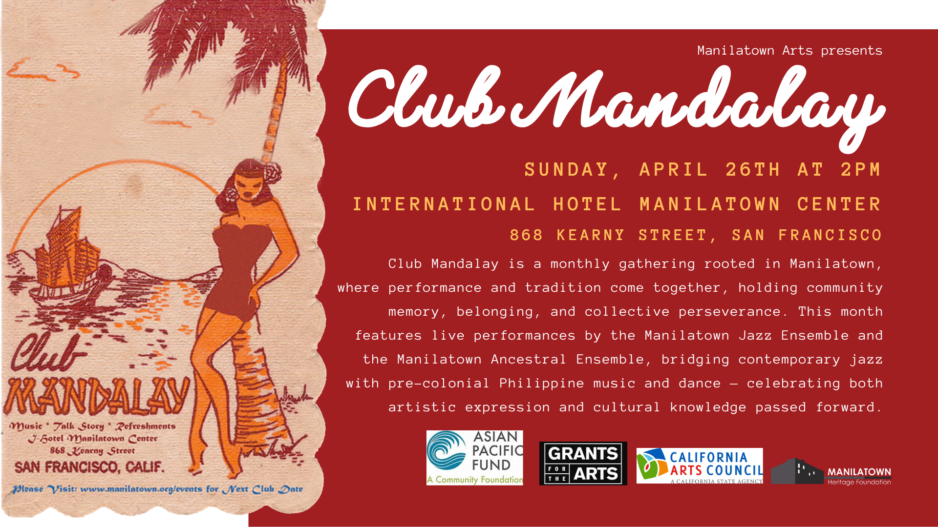 Club Mandalay is made possible by the generous support of the Asian Pacific Fund, San Francisco Grants for the Arts. San Francisco Arts Commission and the California Arts Council. For more information about Club Mandalay, the Manilatown Jazz Ensemble, or the Manilatown Heritage Foundation, please get in touch with us at: mhf@manilatown.org