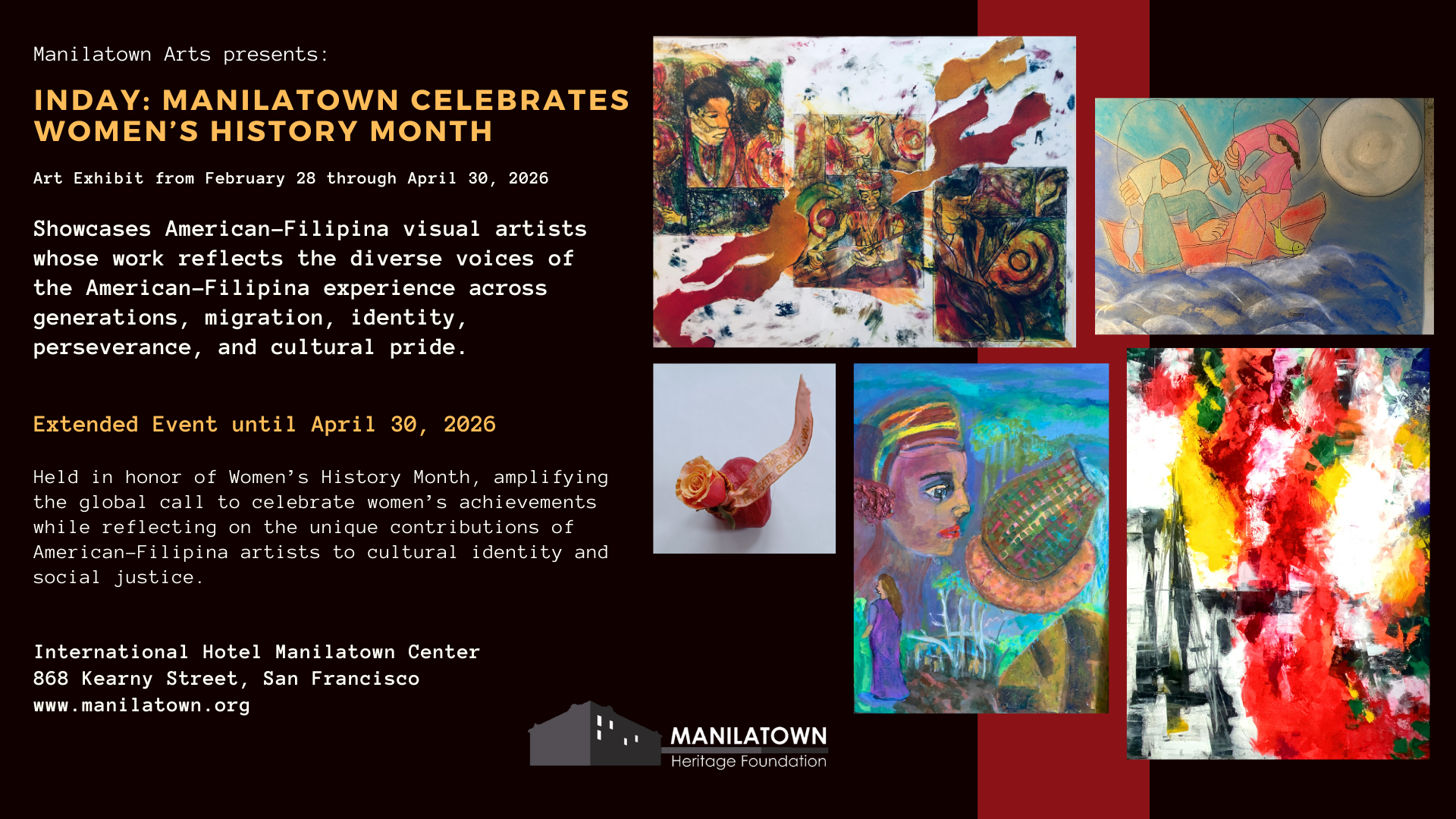 The I-Hotel Manilatown Center, home of the Manilatown Heritage Foundation, is proud to announce that Inday: Manilatown Celebrates Women’s History Month opened to a sold-out audience on February 28, 2026. Due to overwhelming community response and popular demand, the exhibition has been extended through April 30, 2026.